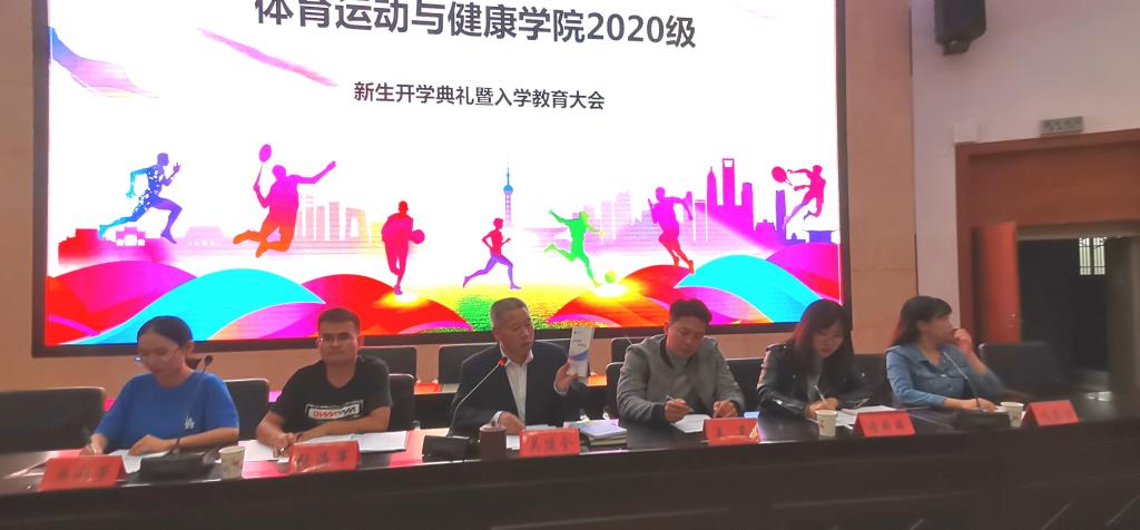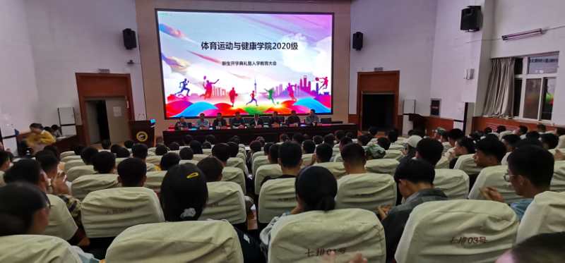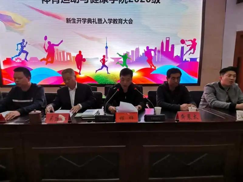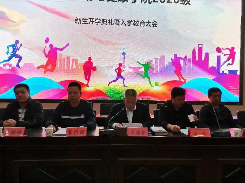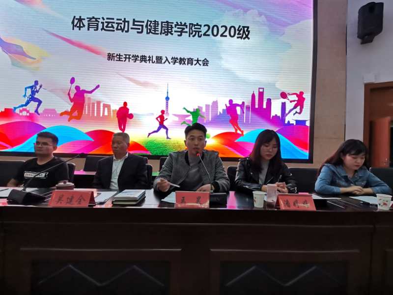 春华秋实,桂果飘香。为欢迎来自甘肃、广东、天津等19个省市(自治区)的215名新同学加入Beat365官方网站大家庭,9月23日晚在二号报告厅隆重举行2020级新生开学典礼暨入学教育大会。学院党总支副书记吴建全,副院长程晖,副院长苏兴田,运动训练系系主任王麒麟,社会体育指导与管理系系主任龚晨太,体育教育系系主任高海利,学院团委书记王昊,办公室副主任马慧琼,2020级各班班主任,教师代表段文义,辅导员以及2020级全体学生参加,典礼由学院党总支副书记吴建全主持。