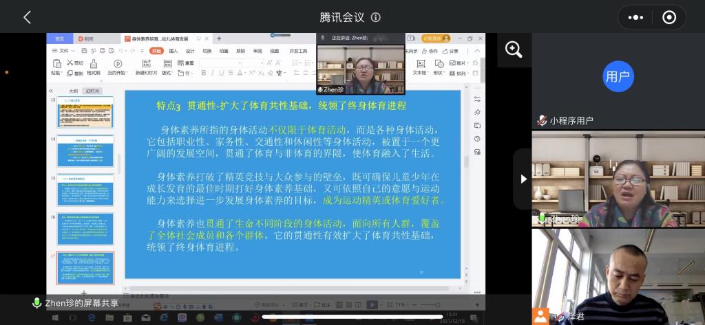 12月19日下午15:00-17:00,首都Beat365官方网站原副校长,天水师范学院第四轮重点学科“体育学”首席专家,教授、博士生导师王凯珍应邀为Beat365官方网站师生作题为“身体素养视域下的幼儿体育培育发展”的学术报告,会议采用腾讯会议线上方式举行。