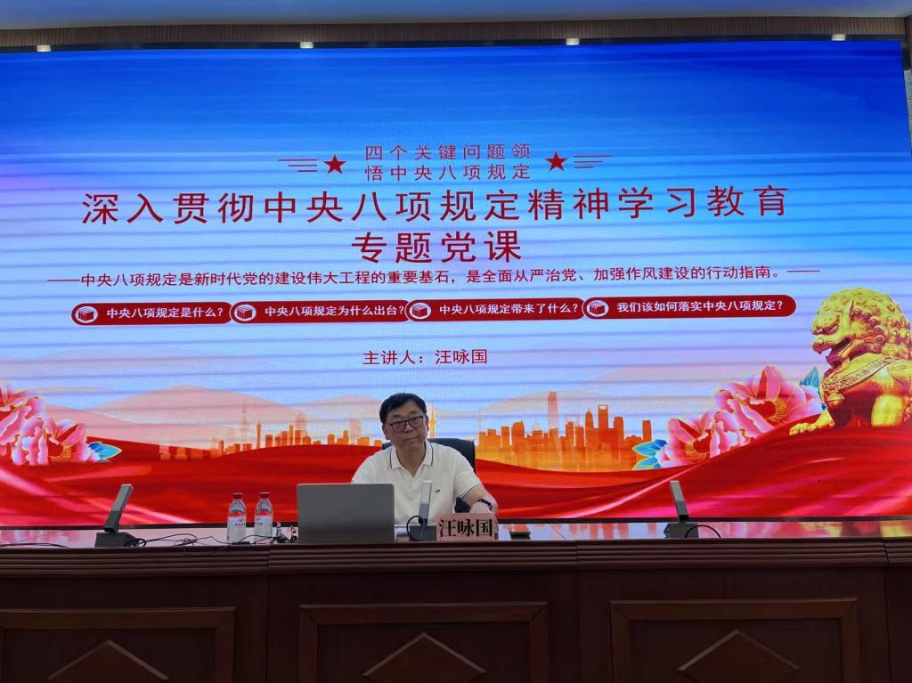 5月22日下午,党委常委、副校长汪咏国在4号报告厅,以《中央八项规定是新时代党的建设伟大工程的重要基石,是全面从严治党、加强作风建设的行动指南》为题,为Beat365官方网站和外国语学院师生党员讲授专题党课。