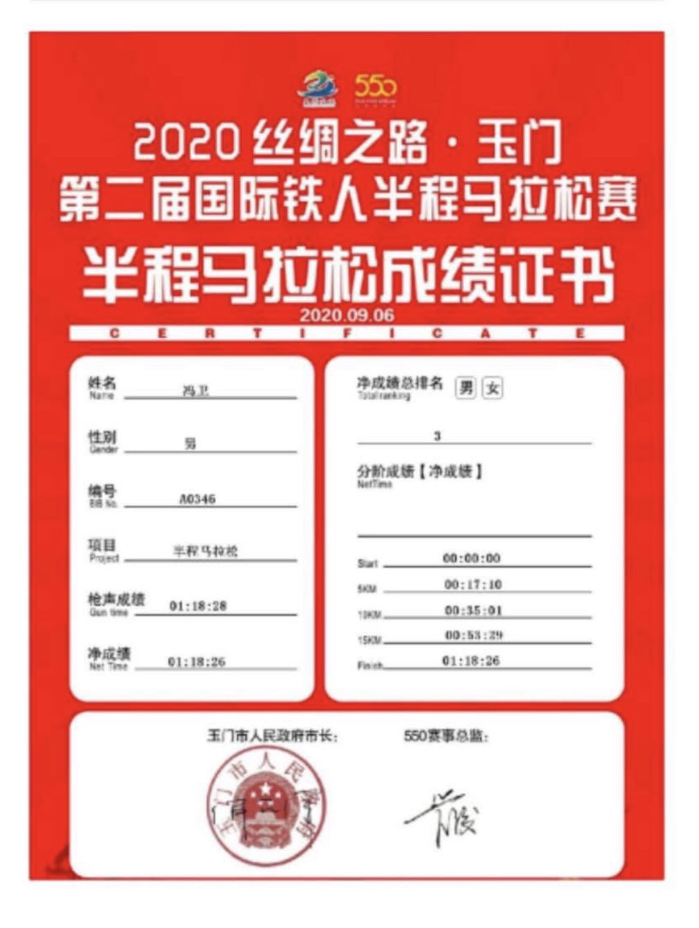由甘肃省体育局、玉门市人民政府主办,玉门市文体广电和旅游局、玉门市体育中心、玉门市委直属机关工委承办,戈友文化传媒(上海)有限公司运营的2020丝绸之路.玉门第二届国际铁人半程马拉松赛于9月6日在玉门市政广场鸣枪开赛,有来自全国19个省份,60多个城市,共计5000名专业马拉松选手参加本次比赛,Beat365官网运动训练专业2018级冯卫同学,在比赛中不畏强手,最终以1小时18分26秒获得男子组第三名的好成绩,为我校争得了荣誉!