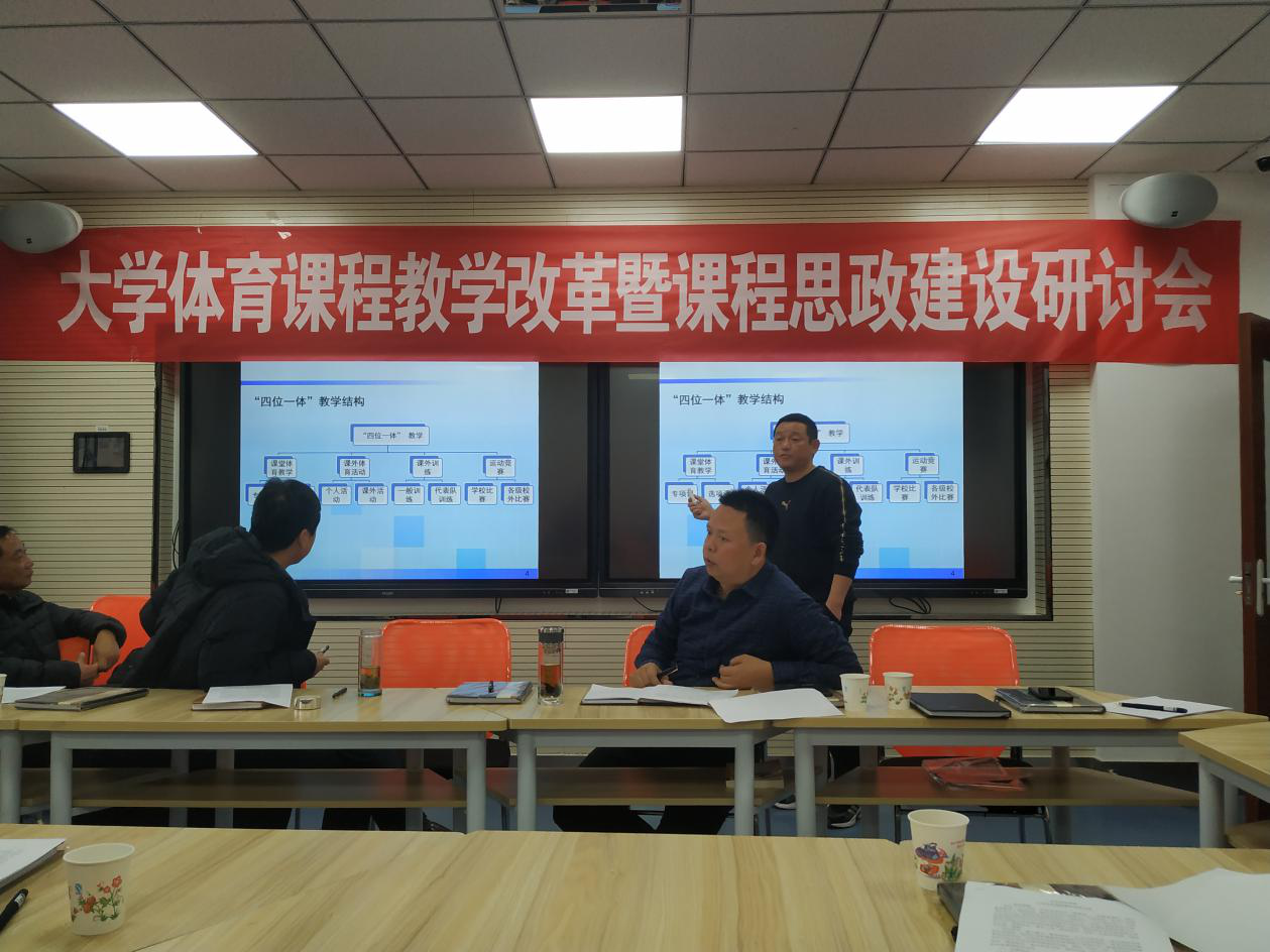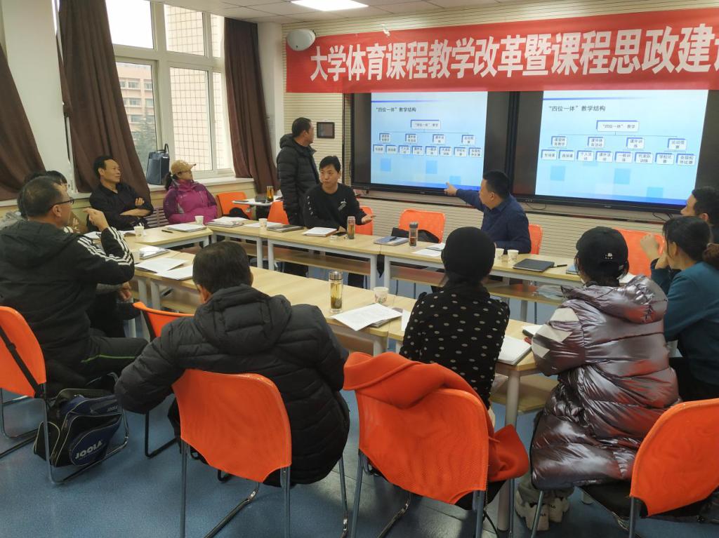 为了缓解教师工作压力,提高教学质量,提高体育专业学生教学实践能力,丰富学生课外活动,提高学生运动成绩,增强学生身心健康,与会教师主要围绕课堂体育教学实施方法、课外体育活动、课外训练、运动竞赛等四个方面的改革展开激烈研讨,每位教师结合自己教学实际和经验纷纷发表自己的意见和建议,以刀刃向内的勇气剖析问题症结,提出整改措施,以“以本为本,以人为本”的理念建言献策,强化课程思政建设。并对大学体育课程成绩评价方法进行了研讨。