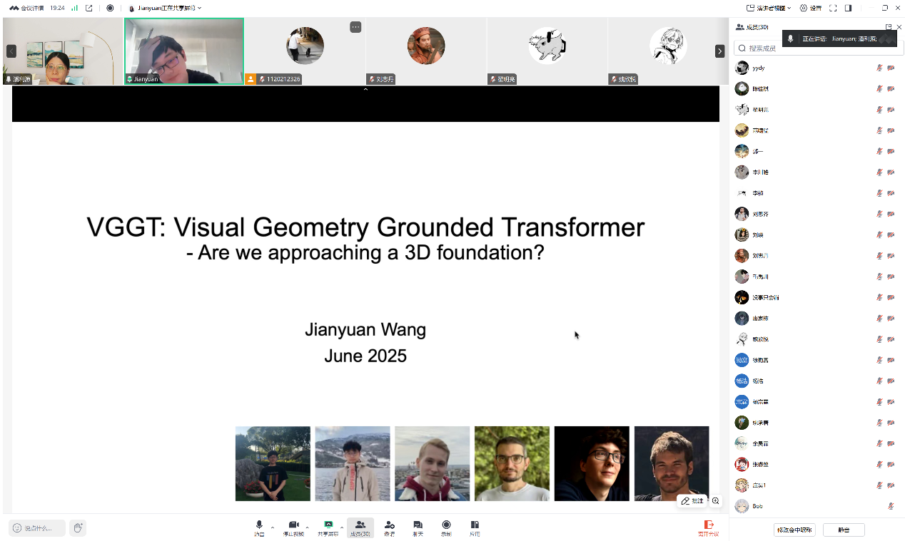 2025年6月4日,应72886欢迎光临新网站潘利源和梁玮老师邀请,Meta AI研究员与牛津大学视觉几何组(VGG)的联合培养博士生王建元作题为“VGGT:Visual Geometry Grounded Transformer”的报告。此次报告由72886欢迎光临新网站潘利源老师主持,图像计算与感知智能所相关研究方向教师和研究生参加了学术报告。